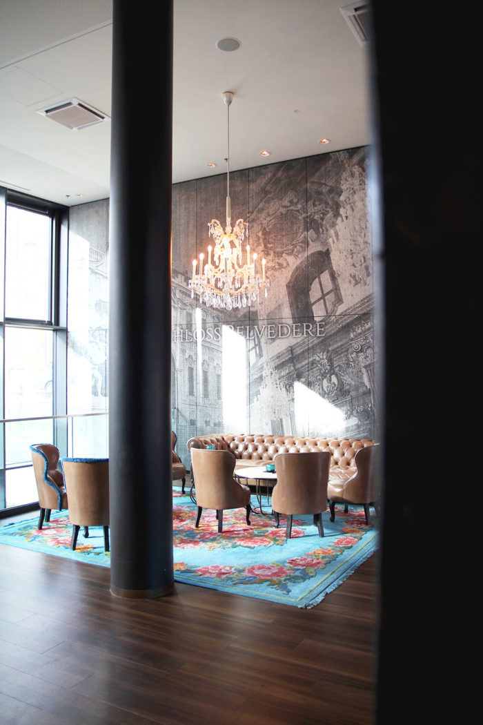 Das Design ist es auch, was mir, neben vielen anderen Dingen, ganz besonders gut gefallen hat. Die Farben Schwarz und Grau gemischt mit türkisen Highlights finden sich im ganzen Hotel wieder. Ist man ganz aufmerksam, merkt man, dass die Gestaltung der einzelnen Bereiche Einblicke in Wiener Stil und Geschichte geben. So wird beispielsweise das direkt neben an gelegene Schloss Belvedere zum Hintergrund in der Lounge und das UNESCO-Weltkulturerbe „Semmeringbahn“ zum Design-Thema des Frühstückbereiches. Das sind so schöne Kleinigkeiten, die ein Hotel für mich zu etwas ganz besonderem machen.